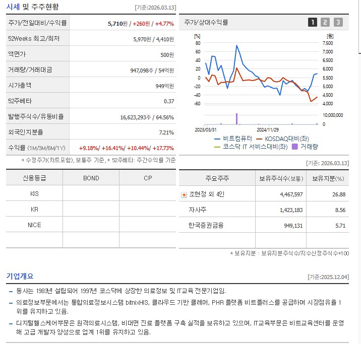 | 비트컴퓨터 | 클라우드 EMR 및 비대면 진료 플랫폼 선두 | 상승세 (5,710원) |