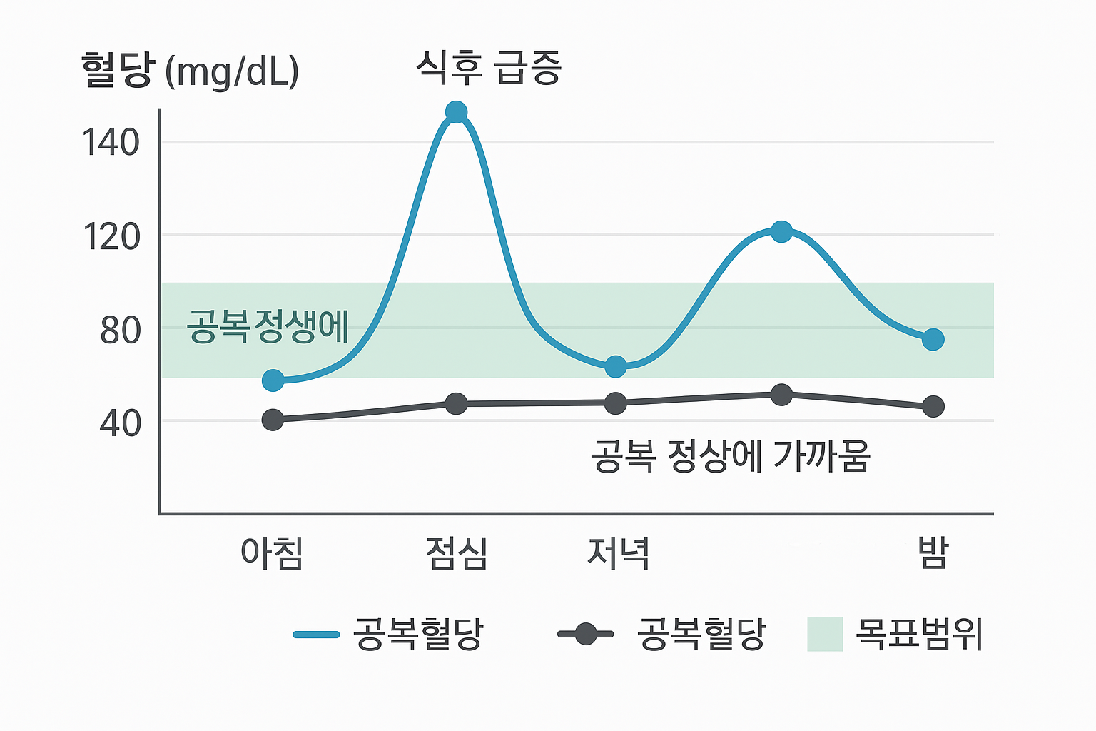 당화혈색소는 평균치를 보여주지만, 하루 동안의 혈당 변동 폭(저혈당·고혈당 패턴)은 파악하지 못합니다. 따라서 공복혈당 + 당화혈색소 검사를 병행해야 정확한 혈당 관리가 가능합니다.