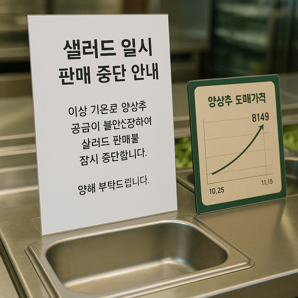 이미지 콘셉트: ‘비어 있는 샐러드 통 + 품절 안내문 + 양상추 시세 급등 그래프’
