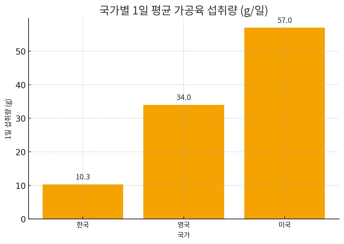 | 국내 1일 평균 가공육 섭취량 | 약 10.3 g | 평균은 낮지만 개인차 큼, 습관적 섭취군 주의 |