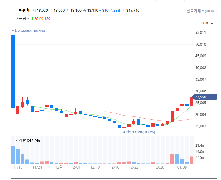 오늘 그린광학 주가가 장중 20%를 넘게 급등했습니다.