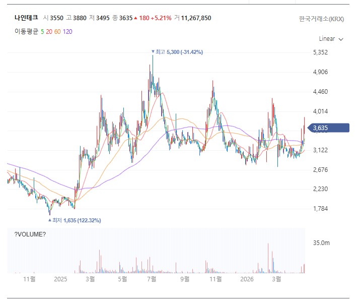**기술적 분석**으로 볼 때, 나인테크 주가는 장기간의 박스권 횡보를 강력한 거래량과 함께 뚫어냈다는 점에서 의미가 큽니다. 이는 단순 테마성 수급이 아닌, 나인테크의 본질적인 기술 가치와 미래 성장성에 대한 시장의 재평가가 시작되었다는 신호로 해석할 수 있습니다. 특히 3,700원 안팎에서 지지선을 형성하며 추가 상승을 시도할 가능성이 높습니다.