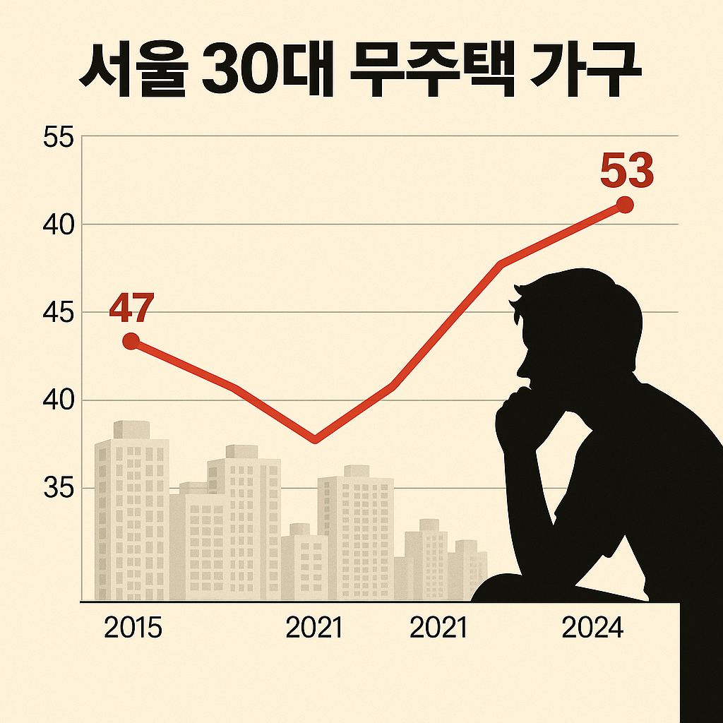 먼저 통계를 한 번 정리해 보겠습니다. 최근 기준으로 서울에 거주하는 30대(가구주 기준) 무주택 가구는 약 52만 7천 가구입니다. 전년 대비 1만 7천 가구 이상 늘어난 수치로, 2015년 통계 작성 이후 가장 많습니다.