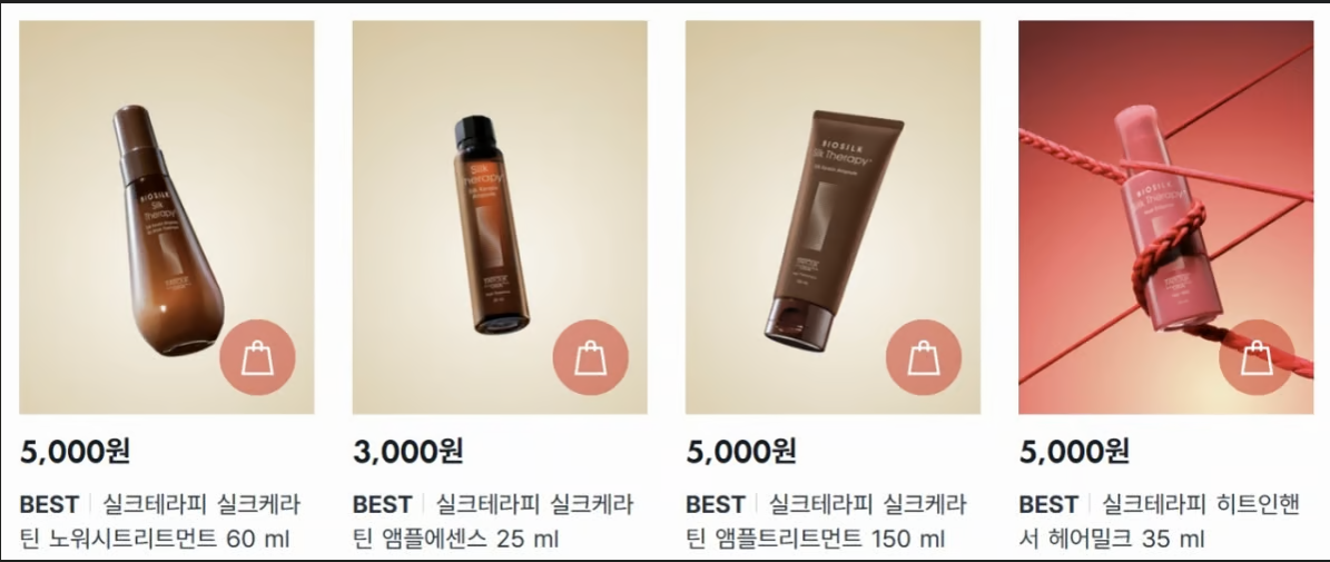 실크세러피는 홈쇼핑과 올리브영 등에서 130ml 기준 3만~5만 원대에 판매되던 대표적 프리미엄 헤어케어 브랜드다. 하지만 다이소에 입점한 제품군은 25ml~150ml 소용량 라인업으로, 가격은 모두 5천 원 이하로 책정됐다.