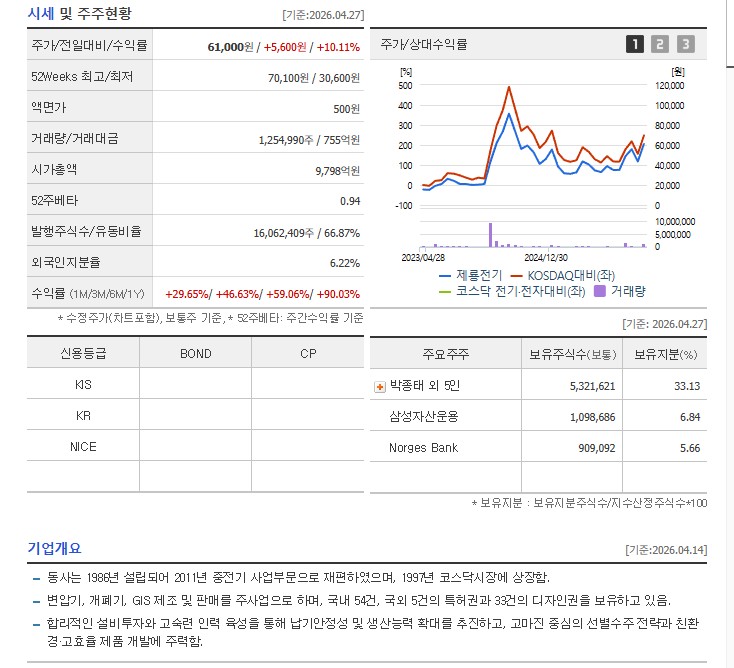제룡전기는 최대주주 및 특수관계인 지분이 안정적으로 확보되어 있어 경영권 리스크가 적은 편입니다. 책임 경영을 바탕으로 친환경·고효율 변압기 개발에 주력하고 있어 ESG 경영 흐름에도 잘 올라타 있습니다.