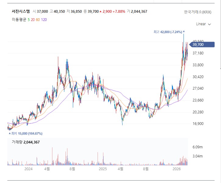 현재 서진시스템의 주가는 과거 통신장비주로 평가받던 시절의 저평가 구간을 지나, ESS 성장주로서 재평가(Re-rating)받는 단계에 있습니다. 2024년 실적 턴어라운드를 시작으로 2025년과 2026년에는 사상 최대 실적이 예고되어 있습니다. 기술적으로는 주요 이평선이 정배열을 그리며 우상향 추세를 유지하고 있으며, 외국인과 기관의 수급이 동시에 유입되는 '쌍끌이 매수'가 나타나고 있어 긍정적입니다.
