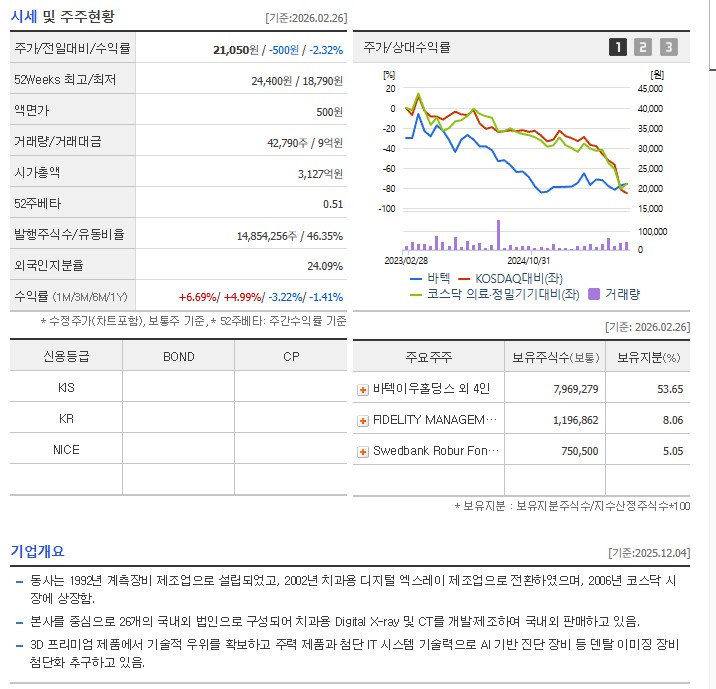 • 증권가의 저평가 조명: 대신증권은 바텍의 시가총액이 보유한 현금성 자산(이익잉여금)에도 못 미치는 수준이라며, 강력한 기업가치 재평가(Re-rating)가 필요하다고 진단했습니다.