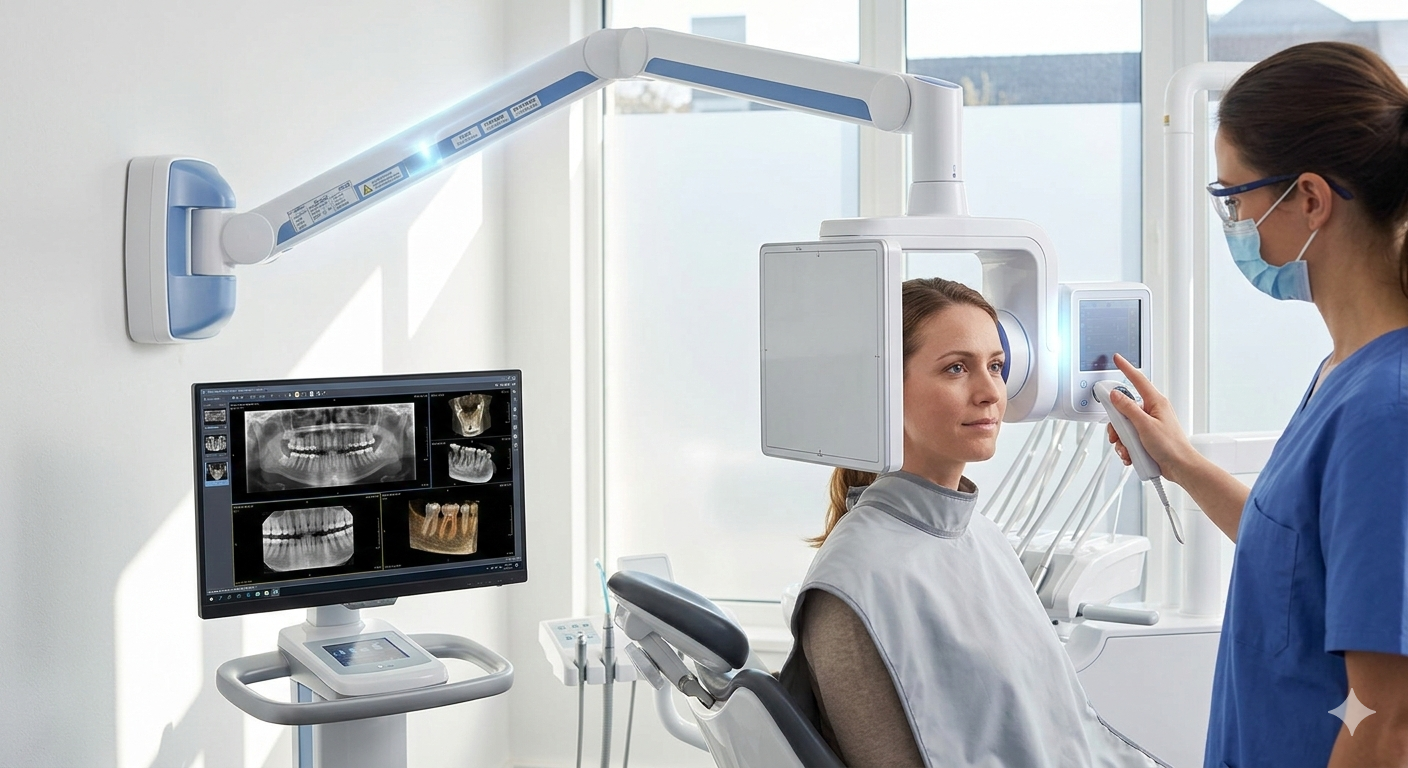 3. 3-in-1 시스템: * 치과에서 흔히 찍는 파노라마(전체 치아 사진), 세팔로(교정용 옆모습 사진), 그리고 CT 기능을 기계 한 대에 모두 담았습니다.