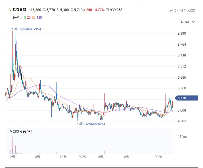 차트 관점에서 비트컴퓨터는 장기 하락 추세를 마감하고 바닥권에서 대량 거래를 동반하며 추세 전환을 시도하고 있습니다. 5,500원 선의 강력한 저항 구간을 돌파하며 안착한 모습이 긍정적이며, 60일 이동평균선이 우상향으로 돌아서며 골든크로스를 형성하고 있습니다.