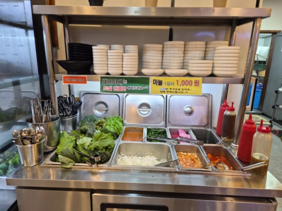 이 집의 또 다른 장점은 야채 셀프바가 따로 있어서 마음껏 먹을 수 있다는 거예요. 상추, 고추, 무 절임 등 여러 가지 채소가 준비돼 있어서 필요한 만큼 가져다가 먹으면 됩니다. 덕분에 야채가 부족할 걱정이 전혀 없어요.