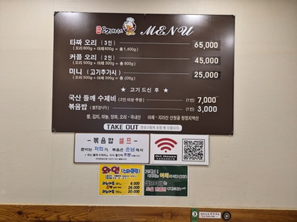 타짜오리하우스의 대표 메뉴는 단연 생오리 불고기예요. 메뉴판을 보니 ‘타짜 오리(3인분)’이 65,000원인데, 3인분이지만 양이 정말 푸짐하다고 해서 바로 주문했어요.