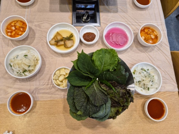 이 집의 또 다른 장점은 야채 셀프바가 따로 있어서 마음껏 먹을 수 있다는 거예요. 상추, 고추, 무 절임 등 여러 가지 채소가 준비돼 있어서 필요한 만큼 가져다가 먹으면 됩니다. 덕분에 야채가 부족할 걱정이 전혀 없어요.