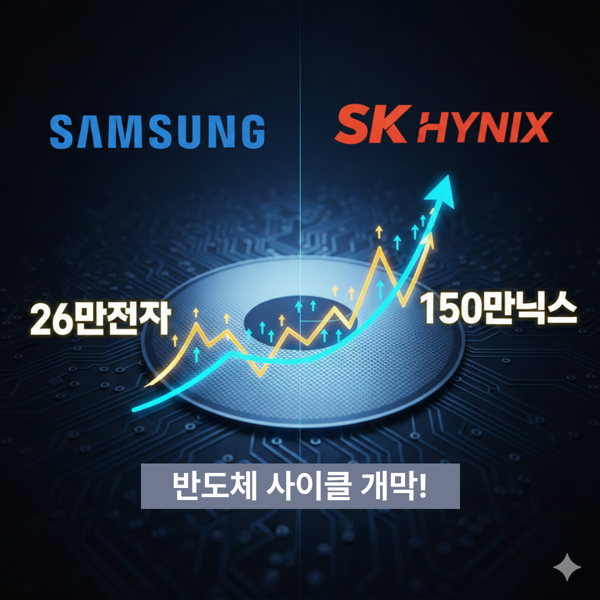 썸네일 ALT 텍스트: 삼성전자와 SK하이닉스 로고가 배경에 있고, 반도체 웨이퍼 위로 주가 상승 그래프가 강력하게 뻗어 나가는 이미지. '26만전자'와 '150만닉스'라는 텍스트가 강조됨.