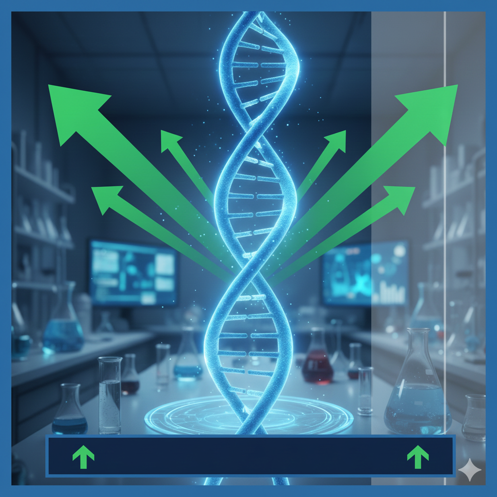 생물보안법 관련주 TOP7, DNA 구조와 성장 화살표가 포함된 바이오 주식 분석 뉴스형 썸네일 이미지