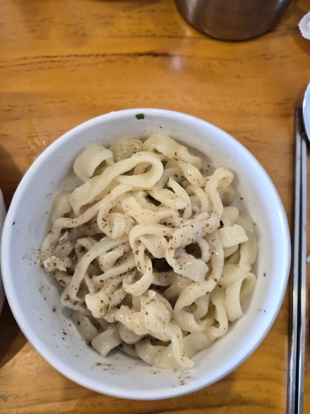 먼저 닭칼국수가 나오자마자 향에서부터 진득한 닭육수 향이 확 올라오더라고요. 맑지만 깊은 국물, 자잘하게 풀어진 닭고기, 그리고 송송하게 올라간 파가 조화를 이루는데 한 입 뜨자마자 “아 이건 웨이팅 해야 한다…”라는 생각이 절로 들었습니다.