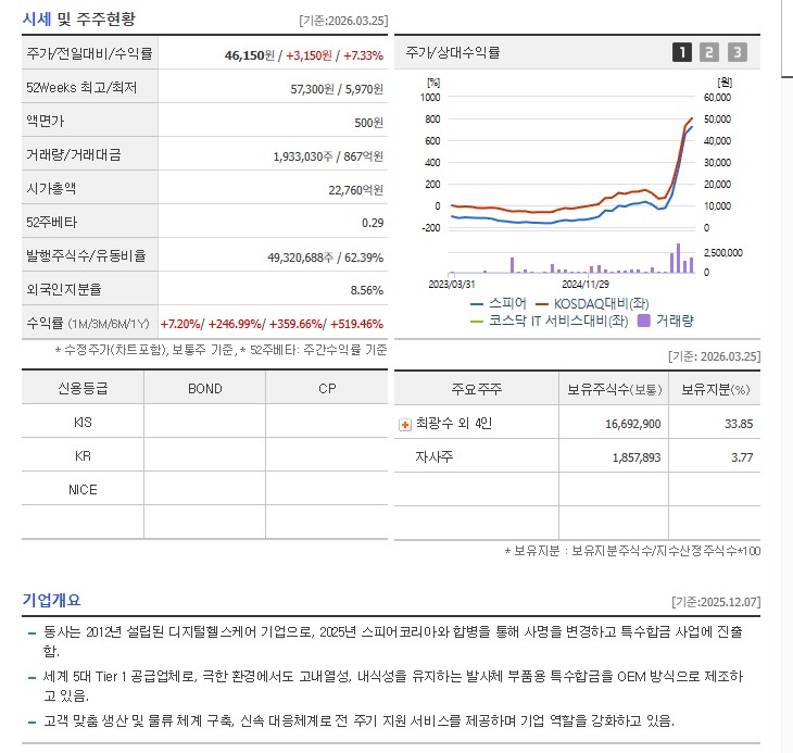 주식을 하시는 분들이라면 이번 공시가 재무제표에 미치는 파급력을 쉽게 짐작하실 수 있을 겁니다. 기존 매출이 25억 원대에 머물던 기업이 단 한 건의 계약으로 280억 원의 매출을 확정 지었습니다. 올해 2분기와 3분기 실적 발표 때 스피어의 매출액과 영업이익은 전년 동기 대비 그야말로 '기하급수적인 폭등'을 기록할 것이 확정적입니다. 고정비를 제하고 나면 남는 이익률도 상당할 것으로 예상되며, 그동안 다소 아쉬웠던 재무 비율(부채비율, 유보율 등)이 단숨에 건전해지는 마법 같은 턴어라운드를 보여줄 것입니다. 우주항공용 특수합금은 고단가 고마진 품목이기 때문에 영업이익률의 극적인 개선을 기대해 봐도 좋습니다.