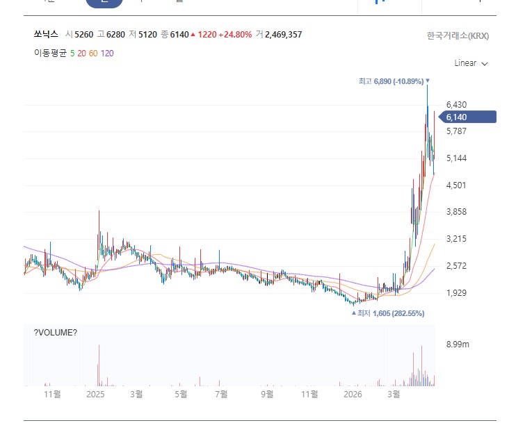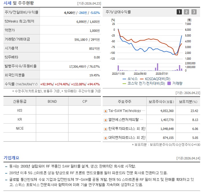 최근 주가 흐름은 핸드셋 업종의 전반적인 회복 기조 속에서 기관과 외국인의 매수세가 유입되며 강력한 탄력을 보여주고 있습니다. 특히 쏘닉스는 단순 부품주를 넘어 통신 필터 파운드리라는 차별화된 비즈니스 모델을 갖추고 있어 시장에서 프리미엄을 받는 흐름입니다.