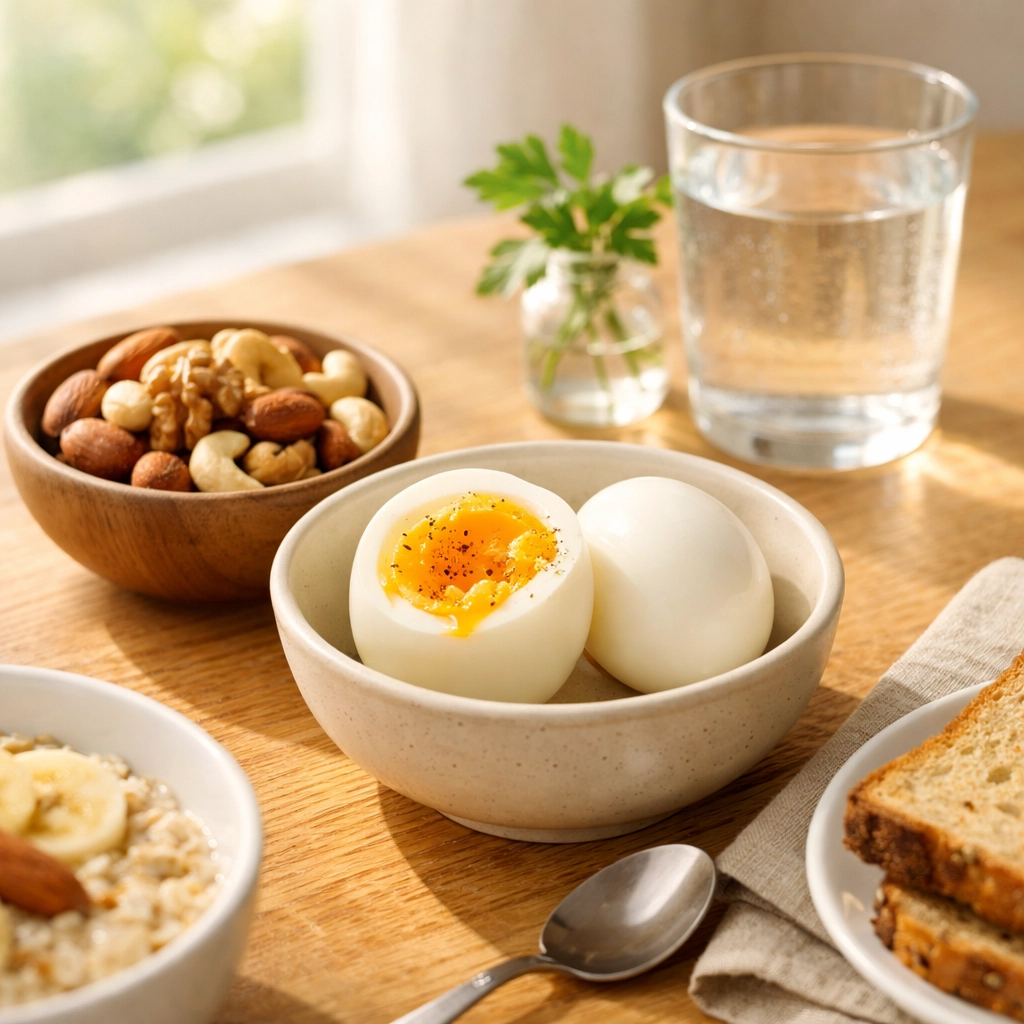 | 달걀 (완전 식품) | 풍부한 단백질 공급, 혈당 안정, 비타민A/D/B 및 무기질, 눈 건강(루테인/제아잔틴) | 아침 공복에 2개 권장 |
