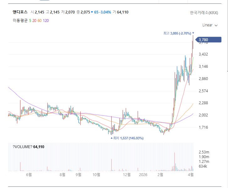 | 앤디포스 | 3,765원 | +5.14% (변동 중) | 약 908억 원 |