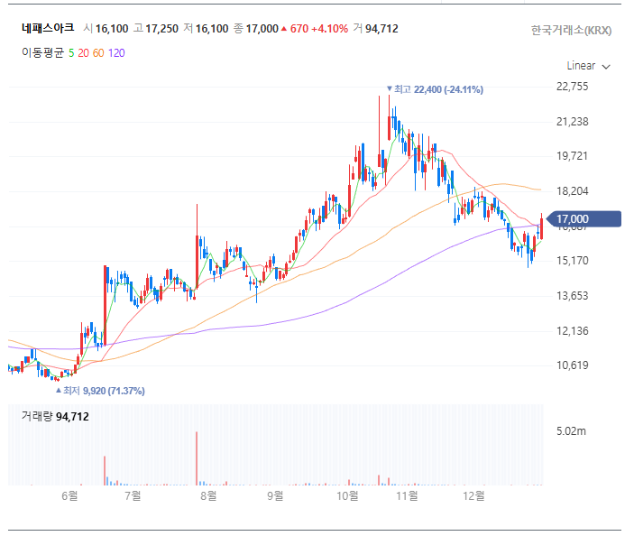 - 주가 전망 및 투자 포인트: 삼성전자의 AI 칩 생산량이 늘어날수록 테스트 외주 비중이 높은 네패스아크의 낙수효과가 큽니다. 현재 주가는 역사적 저점 부근에서 상승 전환을 시도하고 있어 중장기적 관점에서 매력적인 구간입니다.