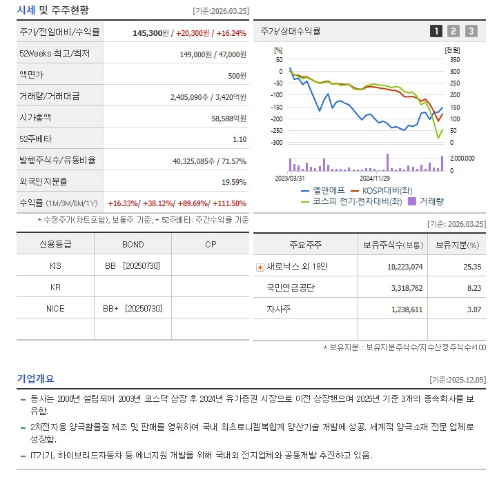 엘앤에프는 최대주주인 허제홍 대표를 중심으로 안정적인 지배구조를 갖추고 있습니다. 최근 주주총회에서는 사채 발행 한도 확대 등 자금 조달 유연성을 높이기 위한 안건이 통과되었습니다. 일각에서 제기된 유상증자 우려에 대해서는 허 대표가 직접 "추가 자금 조달 필요성이 없다"고 선을 그으며 주주들을 안심시켰습니다. 국민연금의 일부 반대 의견도 있었으나 대세에는 지장이 없었으며, 경영권의 안정성 속에 공격적인 투자가 이어질 것으로 보입니다.