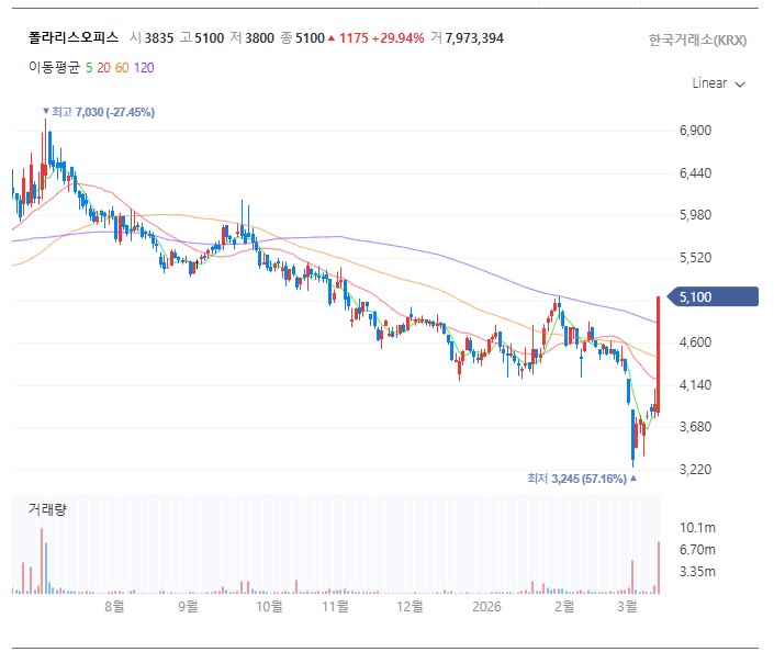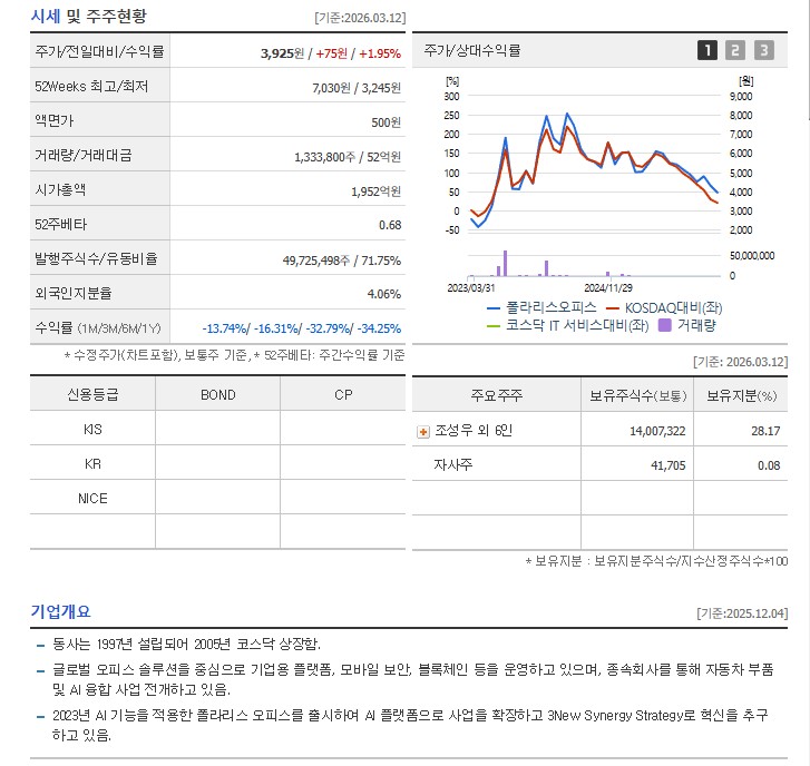 여기에 더해, 3월 13일에는 그룹사인 폴라리스오피스가 오픈AI(OpenAI)와 전략적 파트너십을 맺었다는 소식이 전해지며 그룹주 전체가 들썩이고 있습니다. 폴라리스 AI파마 역시 폴라리스오피스와 공동으로 AI 제약 설루션을 개발 중인 만큼, 이번 협업의 실질적인 수혜를 입을 것으로 기대되고 있습니다.