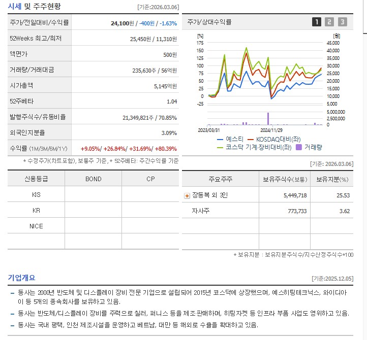 예스티는 반도체와 디스플레이 공정의 핵심인 열처리 및 압력 제어 기술을 보유한 기업입니다. 과거에는 디스플레이 장비 매출 비중이 높았으나, 현재는 고사양 반도체 공정에 필수적인 장비들을 공급하며 '반도체 소부장 대장주' 후보로 거론되고 있습니다. 특히 AI 시대의 총아인 HBM 생산에 필수적인 가압 장비를 생산하며 그 가치를 입증하고 있습니다.