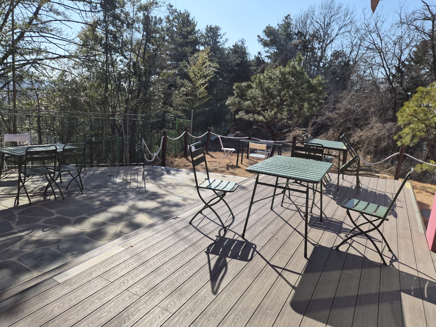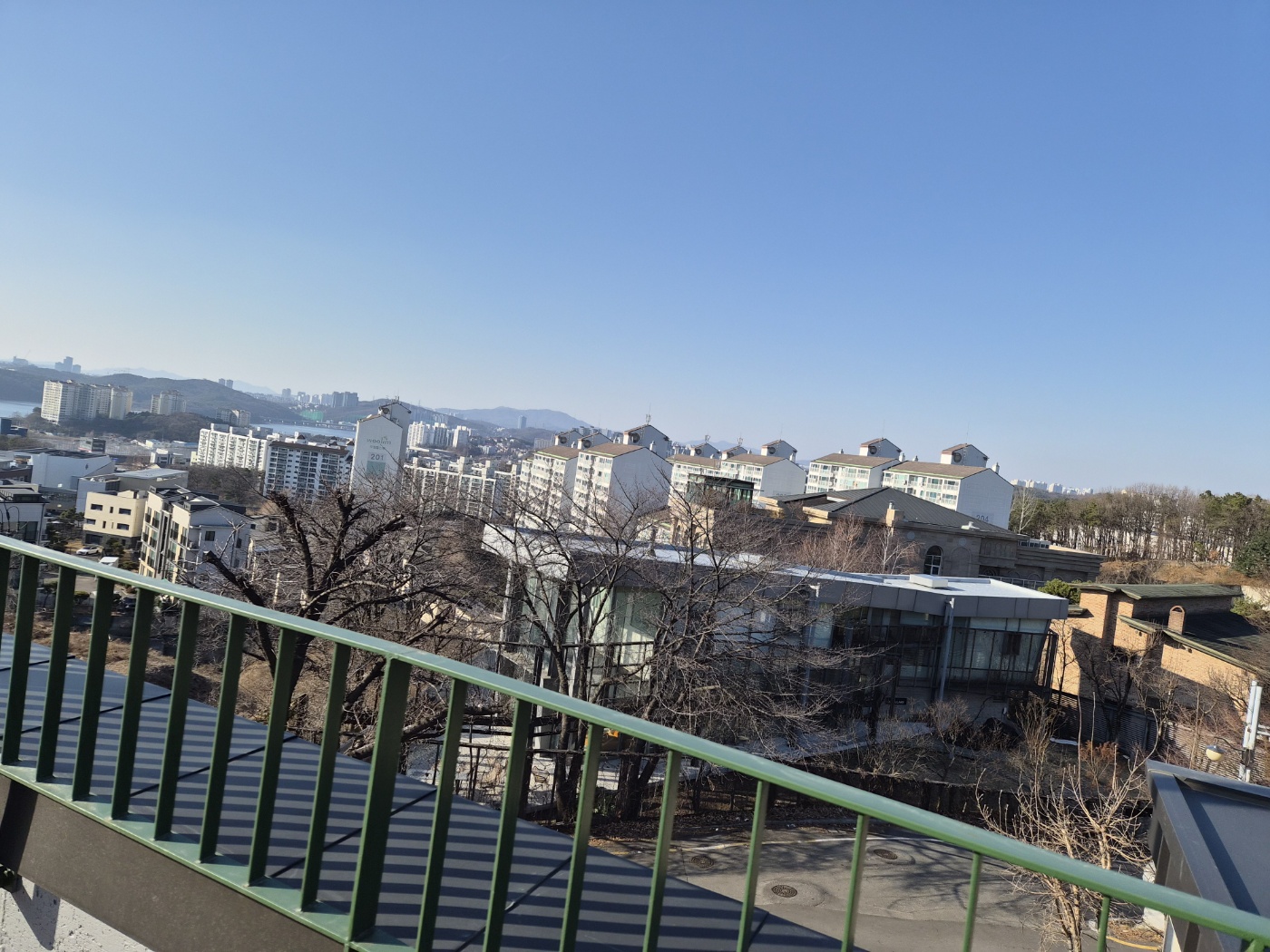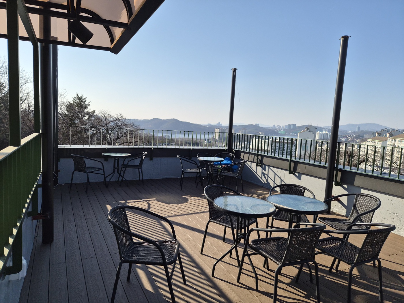 핸드브루하우스의 백미는 단연 테라스 공간입니다. 날씨가 좋은 날 테라스에 앉으면 멀리 기흥  풍경과 함께 주변 산세가 한눈에 들어옵니다. 서울의 빽빽한 빌딩 숲에서 일하느라 지쳤을 딸아이가 이 뷰를 보고 "엄마, 여기 정말 속이 뻥 뚫린다!"라며 좋아하던 모습이 지금도 선하네요. 테라스에는 편안한 의자와 테이블이 마련되어 있어 풍경을 감상하며 커피를 즐기기에 최적의 환경을 갖추고 있습니다.