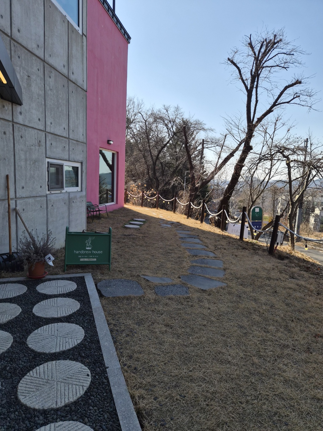 핸드브루하우스는 용인시 기흥구의 한적한 언덕 위쪽에 자리 잡고 있어 도착하자마자 탁 트인 개방감을 선사합니다. 처음 외관을 마주했을 때, 노출 콘크리트와 핑크색 포인트 벽면이 어우러진 현대적인 건물이 참 감각적이라는 생각이 들었어요. 건물 앞에 넉넉한 주차 공간이 마련되어 있어 차를 가지고 방문하기에도 전혀 불편함이 없었답니다.