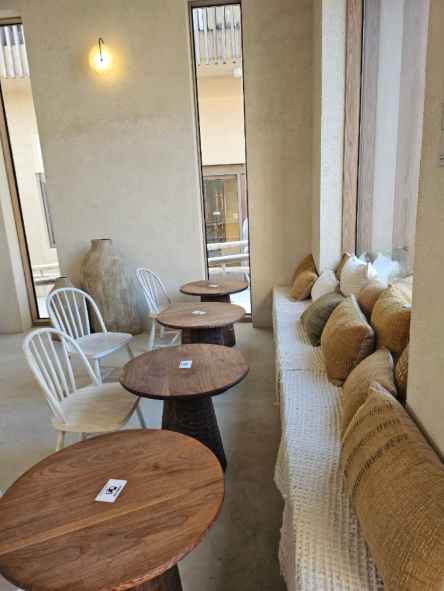 안쪽에는 푹신한 소파들이 두꺼운 나무 테이블과 함께 놓여있어요.