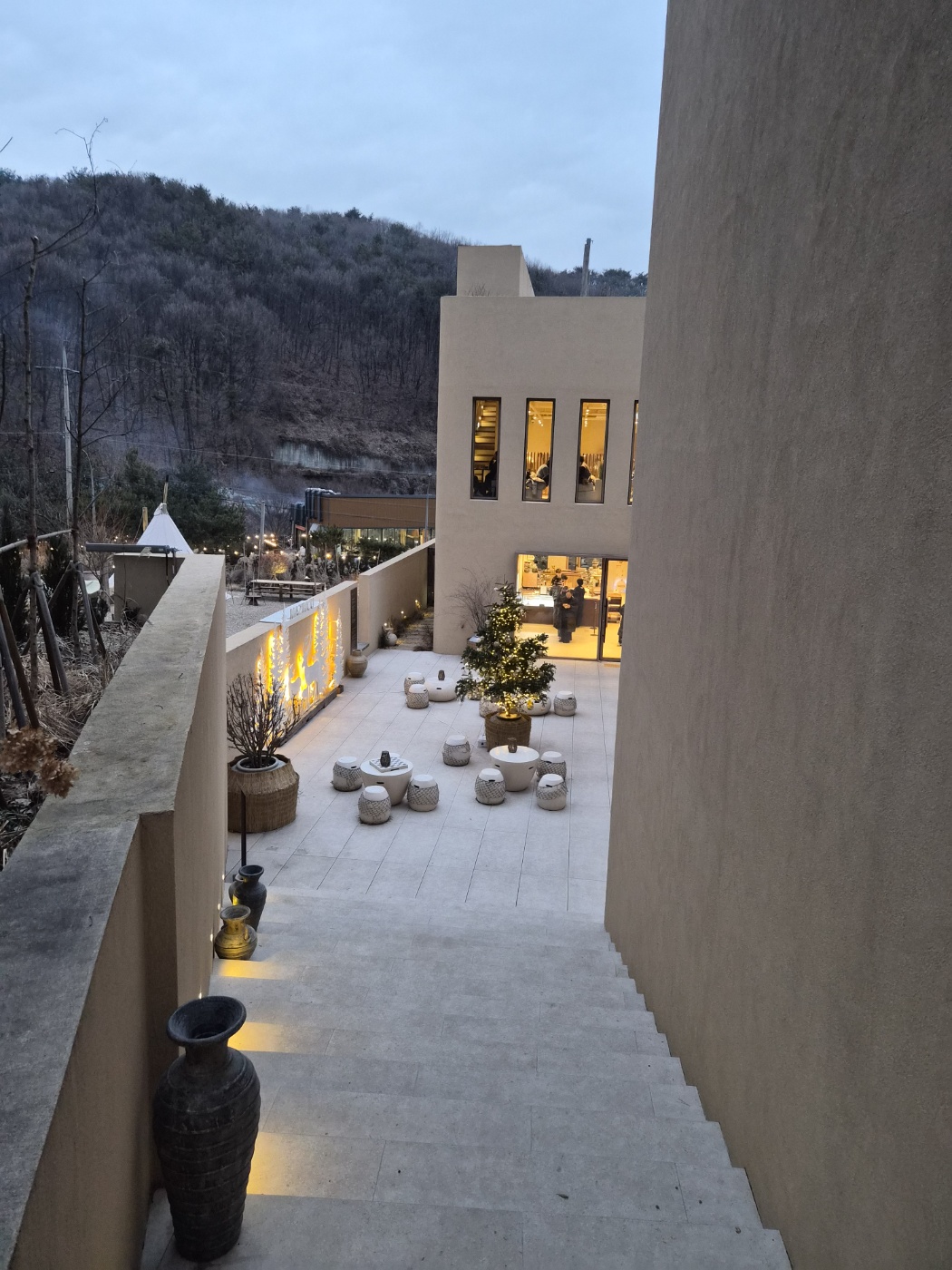 중정 형태의 야외 공간, 층층이 배치된 좌석, 그리고 과하지 않은 조명까지.