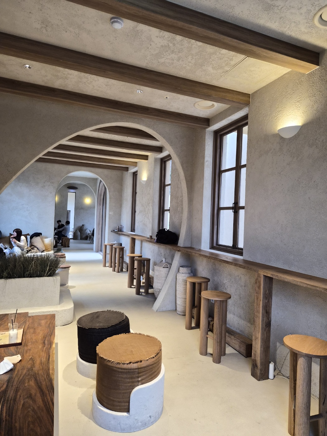 마지모우 카페는 모로코풍 인테리어와 높은 층고로 개방감이 느껴지는 카페입니다. 일반적인 단층 카페 구조가 아닙니다. 계단을 따라 이동하며 자연스럽게 시야가 열리고 닫히는 구조라 마치 전시 공간을 걷는 느낌이 들어요.