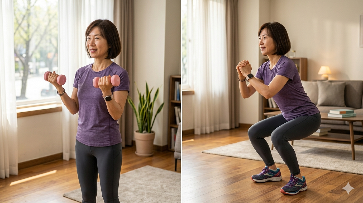 걷기만으로는 부족합니다. 주 2회는 의자를 잡고 스쿼트를 하거나 벽을 짚고 팔굽혀펴기를 하는 등 근육을 자극해 주세요. 근육은 우리 몸의 '연금'과 같습니다.
