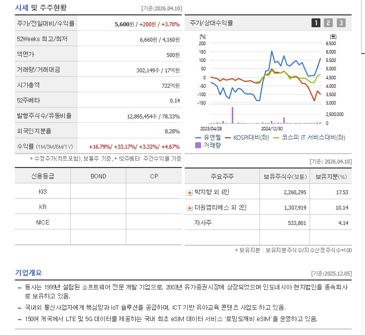 | 유엔젤 (072130) | 5,330원 (▲3.09%) | 5G 솔루션, eSIM 서비스, 자사주 소각 |