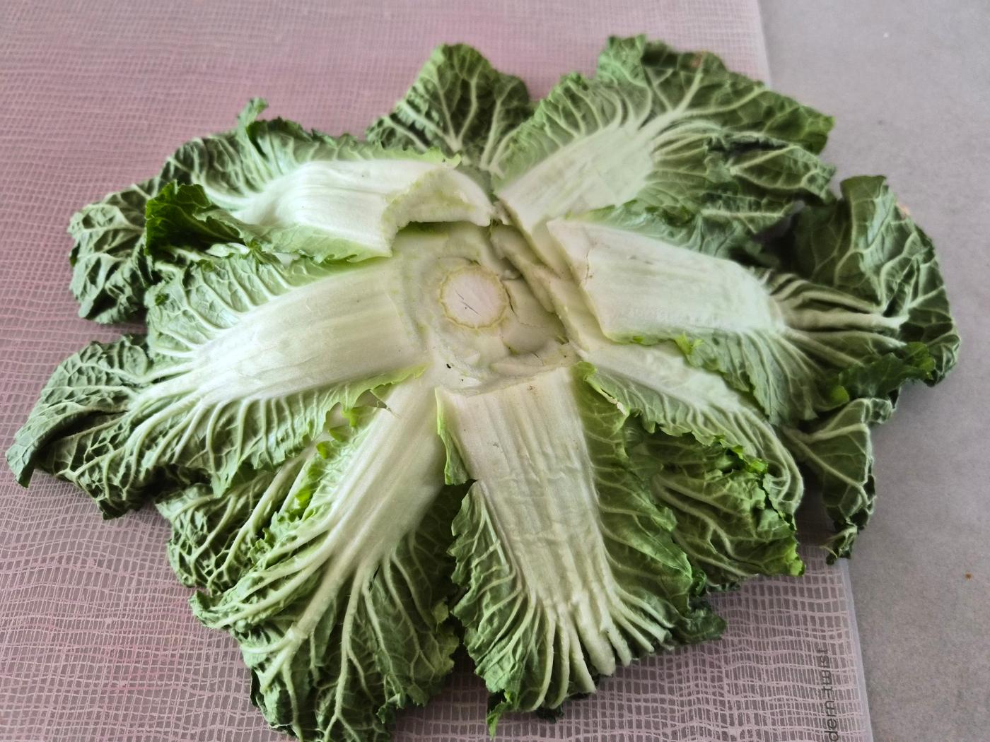 먼저 봄동의 뿌리 부분을 칼로 톡 잘라내면 잎들이 자연스럽게 퍼집니다.