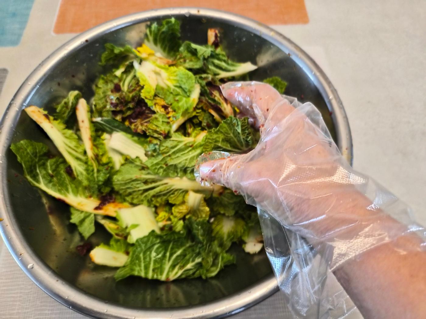 준비한 봄동에 양념장을 넣고 손에 힘을 빼서 살살 버무려 주세요. 너무 세게 치대면 풋내가 날 수 있으니 양념이 골고루 묻을 정도로만 가볍게 무쳐주는 것이 비결입니다. 마지막에 참기름과 통깨를 뿌려 고소한 향을 입혀주세요.