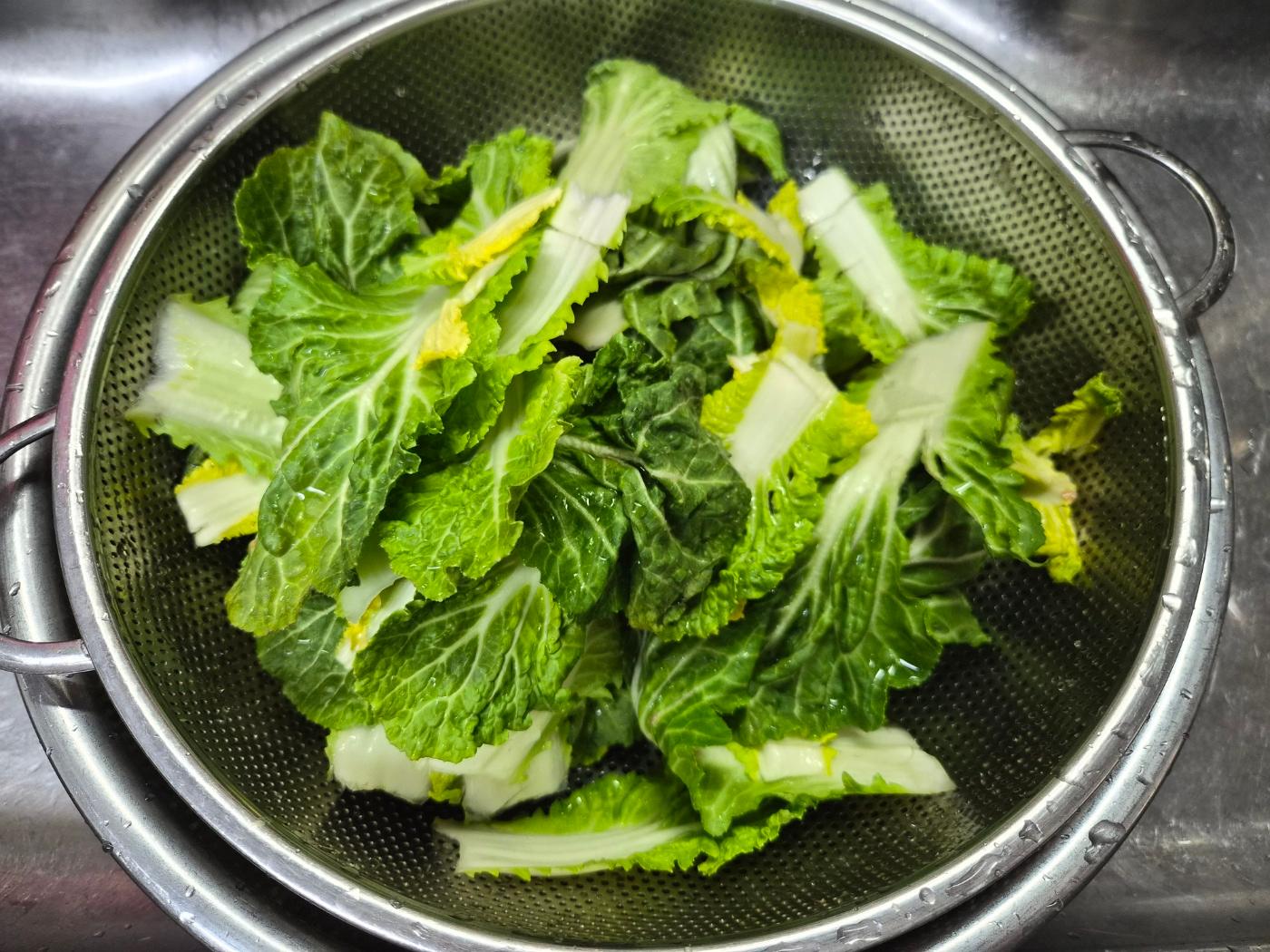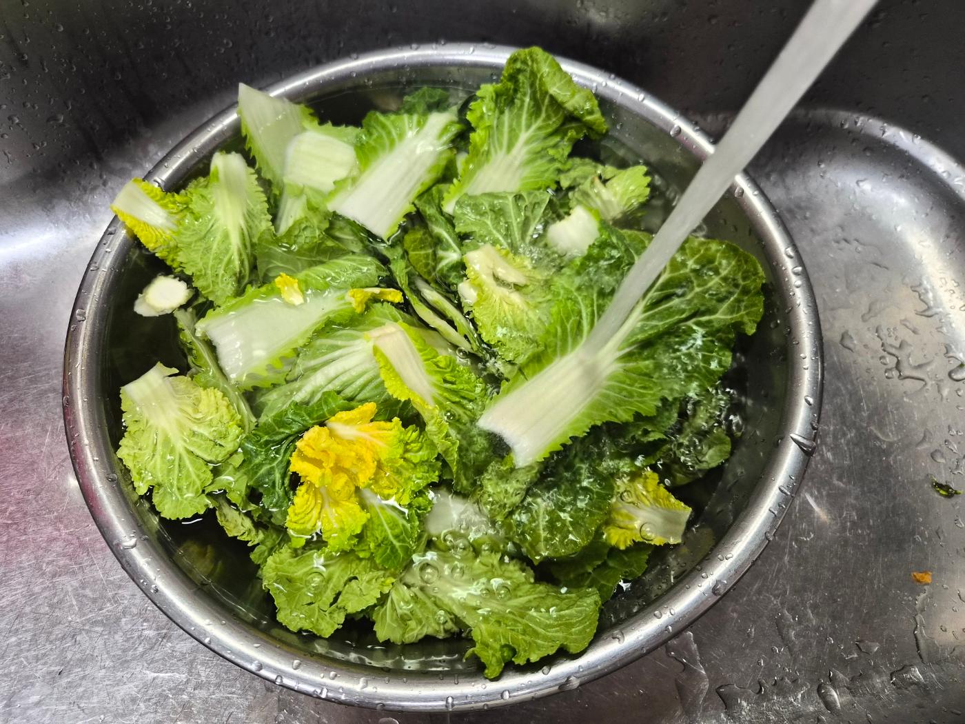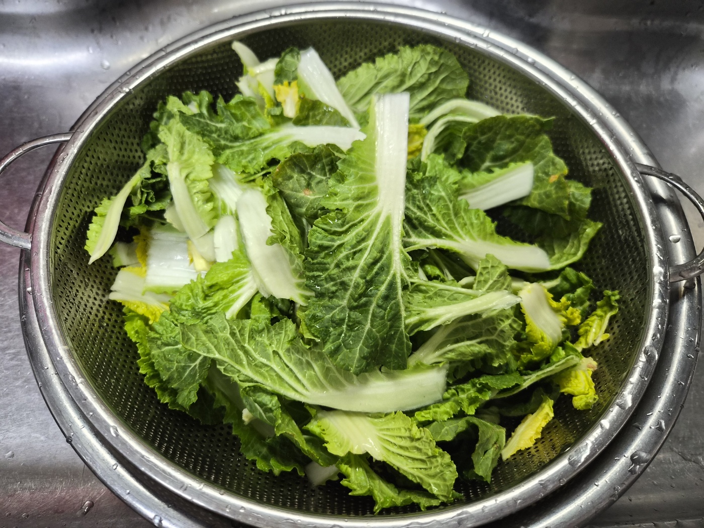 흙이 묻어 있을 수 있으니 흐르는 물에 여러 번 깨끗하게 씻어주세요. 특히 잎 사이사이를 꼼꼼히 헹구는 것이 중요합니다. 씻은 봄동은 체에 밭쳐 물기를 충분히 빼주셔야 비빔밥이 질척이지 않고 아삭함이 살아나요.