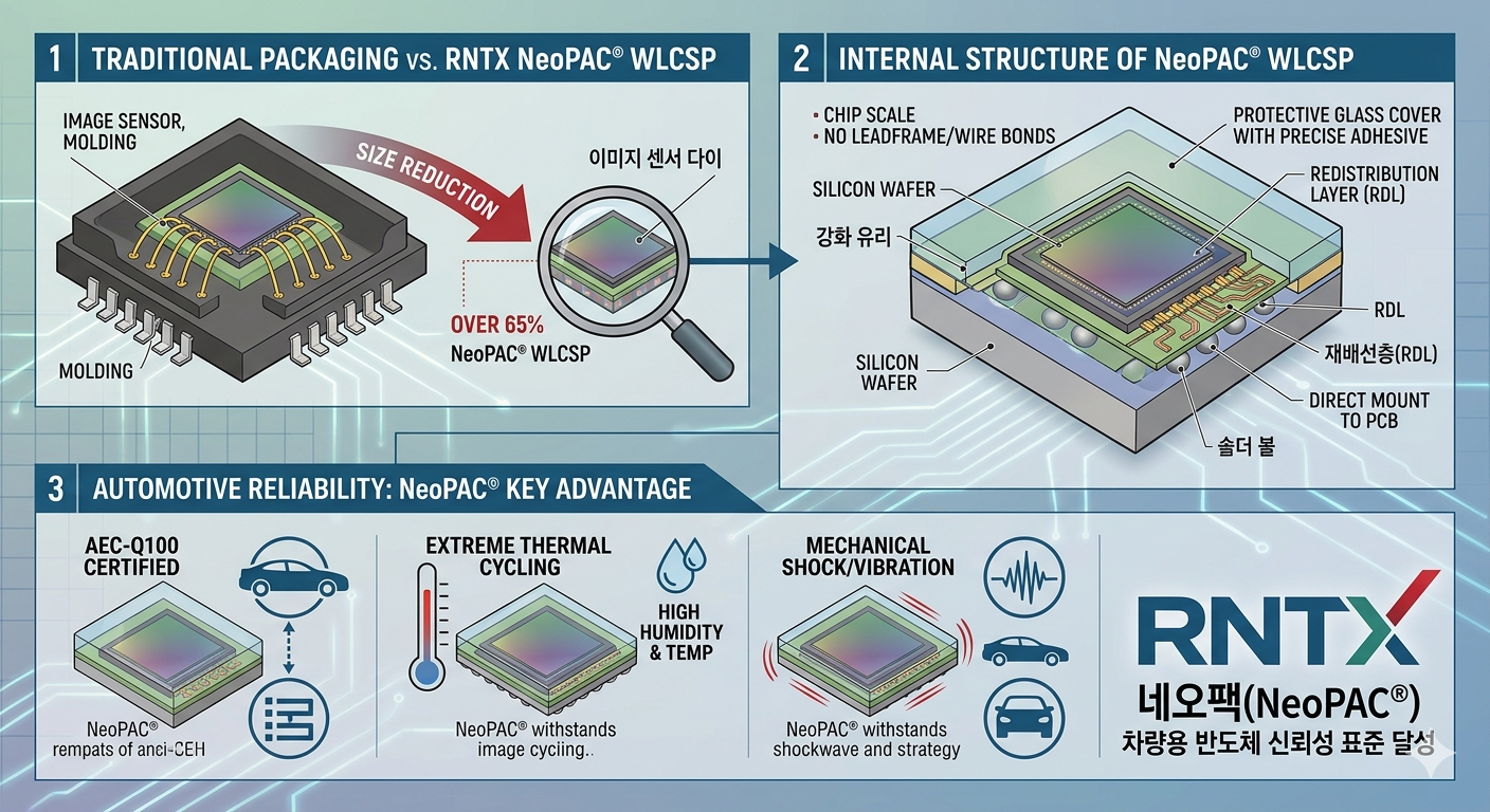알엔티엑스의 네오팩은 일반적인 WLCSP 기술을 기반으로 하지만, 가혹한 자동차 환경에서 견딜 수 있도록 신뢰성을 극대화한 것이 핵심입니다.