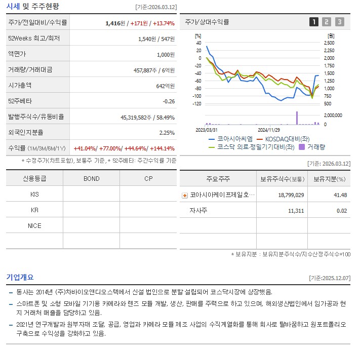 코아시아 그룹 시너지 효과를 톡톡히 보고 있으며, 최대주주인 코아시아를 중심으로 안정적인 경영권을 확보하고 있습니다. 최근에는 광학 렌즈 전문 역량을 강화하며 단순 조립을 넘어 부품 내재화에 힘쓰고 있습니다.