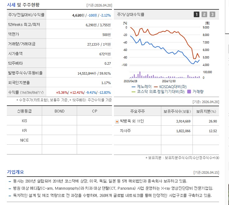 제노레이의 주주 현황을 살펴보면, 창업주 박병욱 대표 및 특수관계인 지분이 안정적으로 확보되어 있어 책임 경영이 이루어지고 있음을 알 수 있습니다. 또한, 회사의 성장성을 높게 평가하는 기관 투자자들과 개인 투자자들이 고루 분포하고 있어 시장의 관심도가 높은 종목임을 보여줍니다. 특히 글로벌 시장 매출 비중이 높은 점이 투자자들에게 매력적인 요소로 작용하고 있습니다.