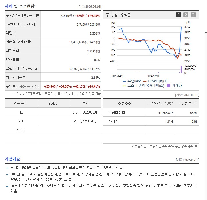 무림P&P의 최대주주는 무림페이퍼로, 그룹 차원의 지배구조가 탄탄하게 얽혀 있습니다. 이번 급등 장세에서 무림페이퍼와 무림SP가 함께 움직이는 이유도 이러한 지배구조와 사업 연관성 때문입니다.