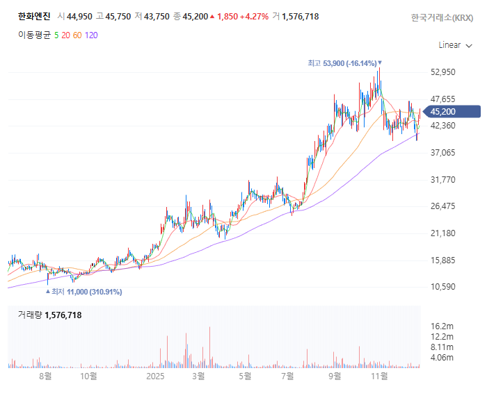 한화엔진은 그룹 방산 시너지 관점에서 자주 언급되는 종목입니다. 조선(한화오션)과 결이 맞물릴 수 있고, 방산 프로젝트가 커질수록 엔진 밸류체인도 함께 주목받습니다.
