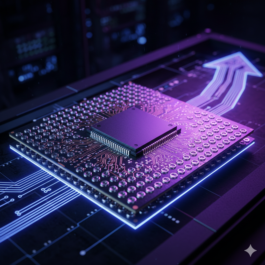 거대한 전력 변압기와 반도체 칩셋이 보랏빛 디지털 광원과 겹쳐져 상승 곡선을 그리는 이미지