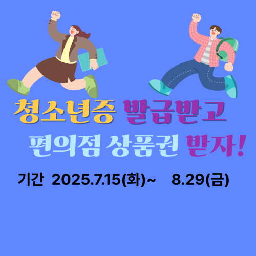 여성가족부는 청소년1388 포털과 함께 2025년 7월 15일부터 8월 27일까지 청소년증 발급 인증 행사를 진행합니다. 행사 기간 동안 청소년증을 신규 발급하고 청소년 1388 포털(https://www.1388)에 인증사진을 올리면, 총 100명을 추첨해 1만 원 상당의 편의점 모바일 상품권을 받을 수 있습니다.
