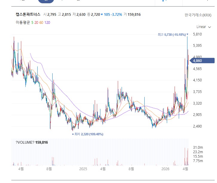 오버행 해소는 단순한 물량 부담 감소를 넘어 **투자심리(T sentiment)의 극적인 회복**을 가져옵니다. 4거래일 연속 상승세가 이를 증명하죠. 기술적으로도 무거운 저항선을 대량 거래와 함께 돌파하며 추가 상승에 대한 기대감을 높이고 있습니다. VC 업황이 전반적으로 개선된다면 캡스톤파트너스의 주가는 더욱 탄력을 받을 수 있습니다.
