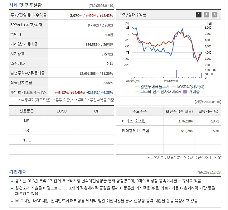 | 알엔투테크놀로지 (148250) | 5,160원 (▲29.97%) | 세라믹 원천소재 기술, 전력반도체 방열 기판 신사업 |