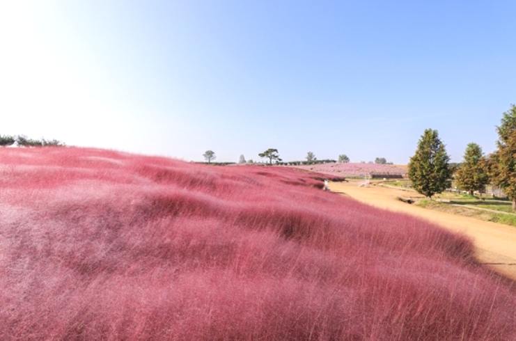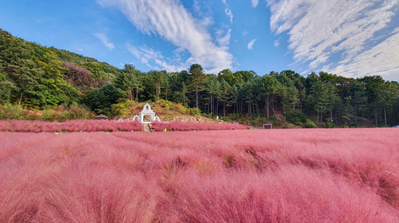 특히 넓게 펼쳐진 핑크뮬리밭은 영화 세트장처럼 환상적인 분위기를 자아냅니다.