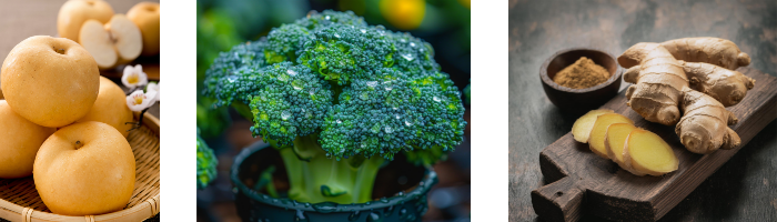 1. 배 — 기관지 진정과 점액 제거에 효과. 따뜻하게 데운 배즙 추천.