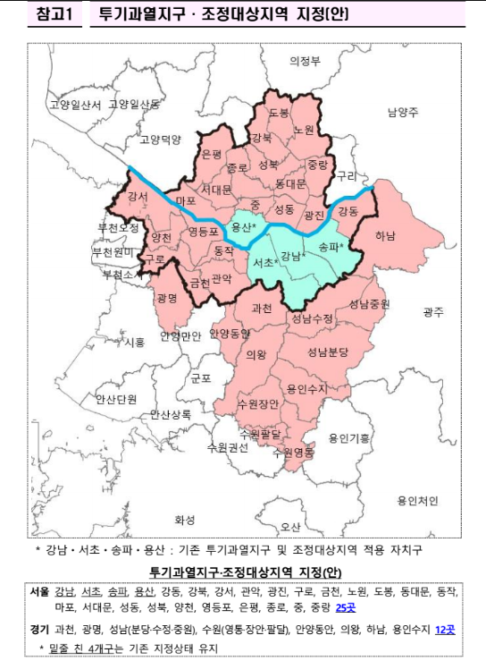 | 규제지역(조정대상+투기과열) | 서울 전역 25개구 + 경기 12곳(과천·광명·성남 분당/수정/중원, 수원 영통/장안/팔달, 안양 동안, 용인 수지, 의왕, 하남) | 10월 16일 | 대출·청약·세제 강화 |