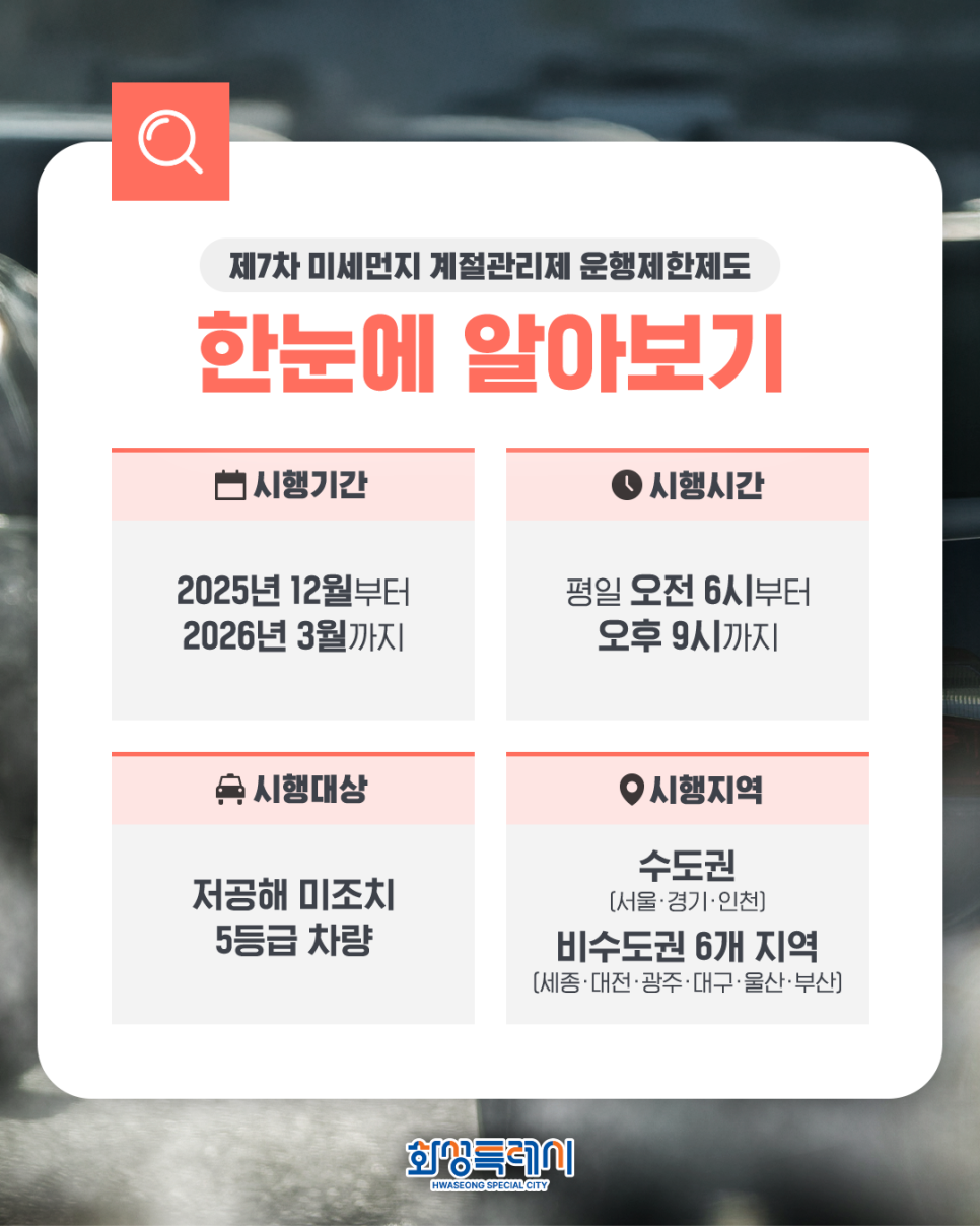 2025년 겨울에도 동일하게 제도가 시행된다. 특히 수도권뿐 아니라 세종·대전·광주·대구·울산·부산 등 주요 비수도권 지역까지 확대되며 단속 강도가 강화된다. 5등급 차량을 보유한 운전자는 단속 기준, 예외 대상, 과태료 규정을 반드시 확인해야 한다.